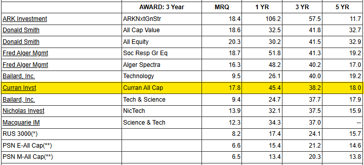 All Cap - 12 Quarters (3 Years) Ending 3/31/2024 – This same portfolio (Curran’s SMID Cap Equity) ranked 7th in a universe of 394 products from 241 firms with a rate of return of 38.2%*. The Russell 3000 Index (the index to which this category is benchmarked and measured against) returned 24.1% for the same period.
